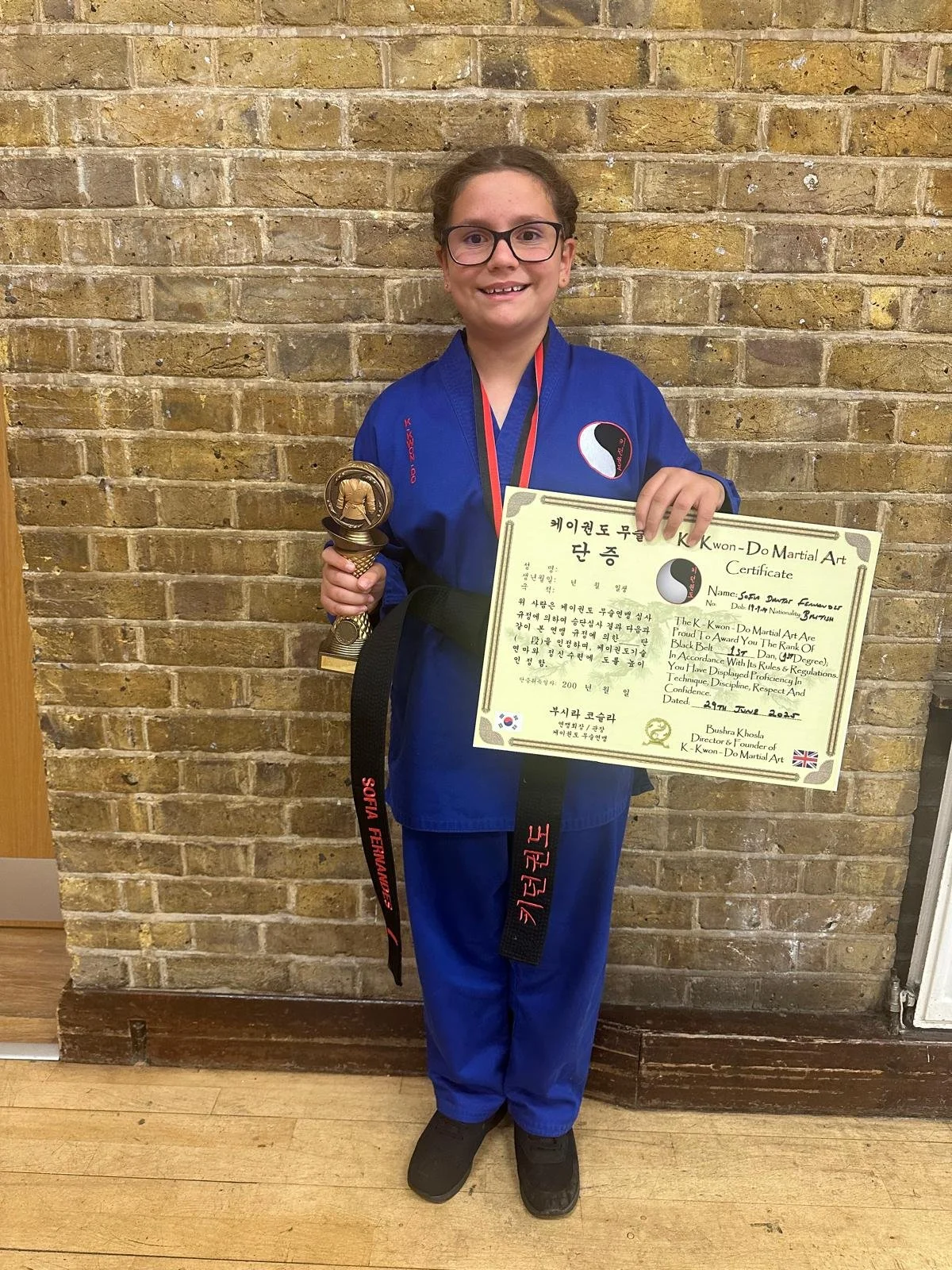 Congratulations Miss Sofia Fernandes 23 Jul Written By Ms Khosla Miss Sofia Fernandes achieves her 1st degree black belt. View fullsize Ms Khosla https://www.kkwondo.org